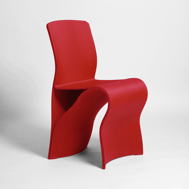 Tillverkad av en industriellt komposterbar bioplast och träfibrer, dess flödande form och flexibla ryggstöd erbjuder komfort samtidigt som den gör ett djärvt uttalande inom cirkulär design.